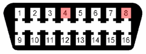 3. Mediante un cable con fusible haga un puente entre el pin 4 y 8 del conector de diagnóstico OBD (la posición de los pines se enumeran en la fila superior de izquierda a derecha 1>>>8 y en la fila inferior de izquierda a derecha 9>>>16)
